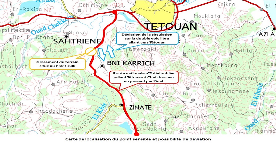 Le Ministère de l’Equipement, du Transport, de la Logistique et de l’Eau informe les usagers de la route que le tronçon de la Route Nationale n°2 reliant Tétouan et Chefchaouen au PK59+600, connait une perturbation partielle de la circulation depuis le lundi 1er février 2021 sur la voie de circulation menant vers Chefchaouen et ce, suite à l’apparition d’un glissement de terrain sur la rive droite de la voie, allant vers Chefchaouen à la commune Ben Karrich.