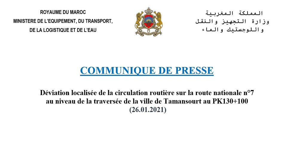 Le Ministère de l’Equipement, du Transport, de la Logistique et de l’Eau informe le public que le tronçon reliant la ville de Tamansourt et Oued Bouzmour connaitra une perturbation momentanée de la circulation, le jeudi 28 janvier 2021 de 09H00 à 17h00, à cause des travaux de pose d’une passerelle métallique au point kilométrique 130+100.