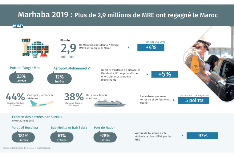 Rabat – Plus de 2,9 millions de Marocains Résidant à l’Etranger (MRE) ont regagné le Maroc lors de la campagne Marhaba 2019, soit une augmentation de 4% par rapport à 2018, indique l’Administration des Douanes et impôts indirects (ADII).