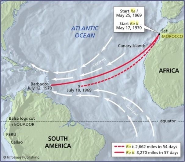 L’expédition « RA 2 », initiée par le célèbre explorateur norvégien Thor Heyerdahl, visait à prouver que les civilisations anciennes pouvaient avoir traversé l’océan Atlantique à bord d’embarcations en papyrus, reliant ainsi l’Afrique aux Amériques bien avant l’ère moderne. Le radeau a quitté le port de Safi le 17 mai 1970, et après 57 jours de navigation, l’équipage a accosté à La Barbade, dans les Caraïbes. Ce voyage a démontré qu’il était possible, même à l'époque préhistorique, de traverser l'Atlantique avec des moyens rudimentaires, une hypothèse qui éclaire les similitudes architecturales et culturelles entre l’Égypte antique et les civilisations précolombiennes d’Amérique latine.