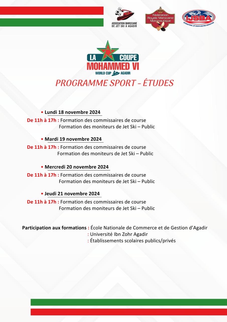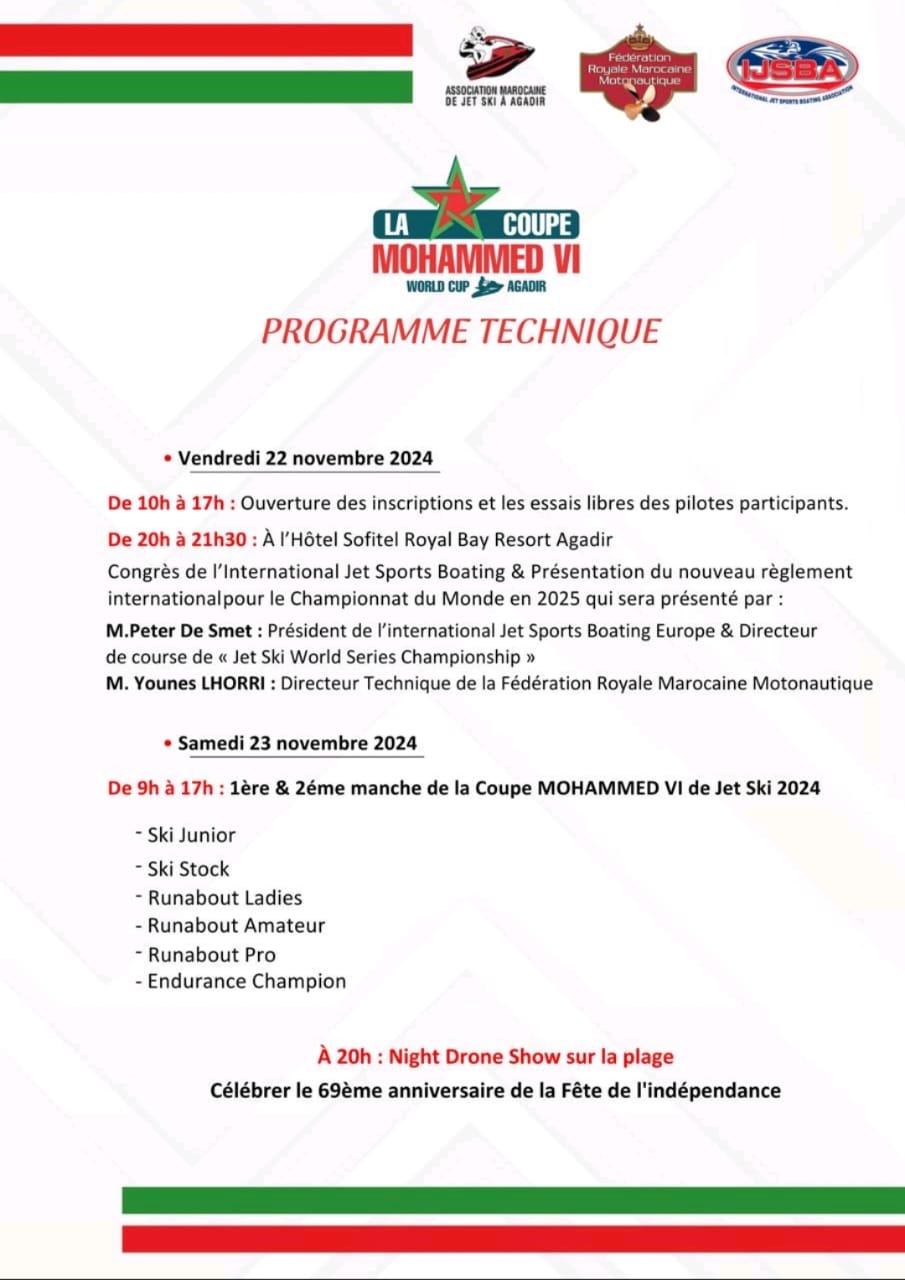 La Coupe Mohammed VI de Jet Ski à Agadir promet d'être un événement marquant, combinant compétition, formation et festivités. Ce rendez-vous annuel réunit non seulement les meilleurs athlètes du monde entier, mais contribue également à la promotion du sport nautique au Maroc et au développement des compétences locales. Cette édition 2024 ne manquera pas de renforcer la réputation d’Agadir comme destination de choix pour les sports nautiques.