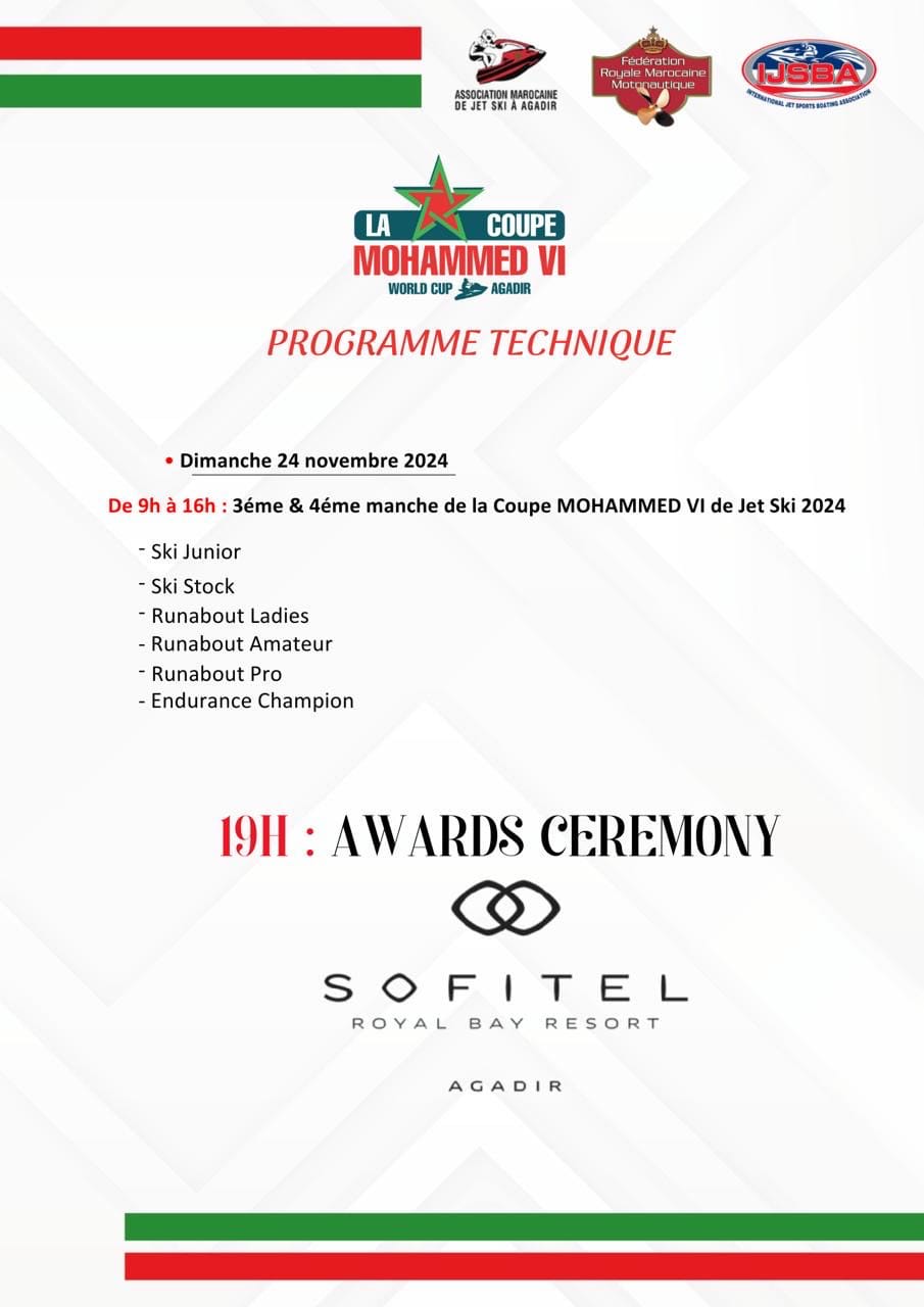 Les épreuves de la Coupe Mohammed VI de Jet Ski débutent le samedi 23 novembre avec les premières et deuxièmes manches de la compétition, de 9h à 17h. Les participants s'affronteront dans différentes catégories : Ski Junior, Ski Stock, Runabout Ladies, Runabout Amateur, Runabout Pro, et Endurance Champion. Ces catégories couvrent un éventail de niveaux et de compétences, permettant aux athlètes de tous horizons de concourir.