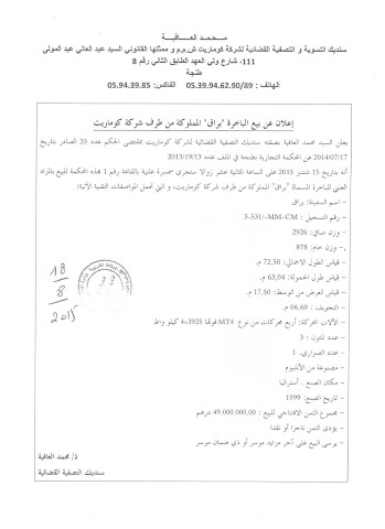 تم بتاريخ 15 شتنبر بالمحكمة التجارية بطنجة تنظيم سمسرة عمومية من طرف سانديك تصفية شركة كوماريت من أجل بيع الباخرة السريعة براق.