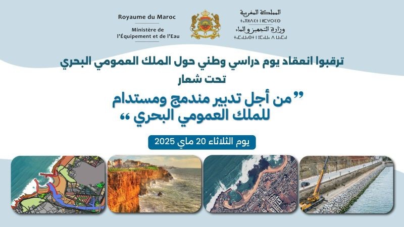 وزارة التجهيز والماء تنظم يوما دراسيا وطنيا حول الملك العمومي البحري، يوم الثلاثاء 20 ماي 2025، تحت شعار "من أجل تدبير مندمج ومستدام للملك العمومي البحري"، بمشاركة مختلف المتدخلين المعنيين بالمجال، فضلا عن ثلة من الخبراء ومكاتب الدراسات المكلفة بإعداد خرائط الهشاشة الساحلية إزاء المخاطر الطبيعية وتتبع خط الساحل، وذلك قصد بلوغ التقائية في الرؤى والاستراتيجيات، وتقاسم التجارب وتبادل المعلومات.