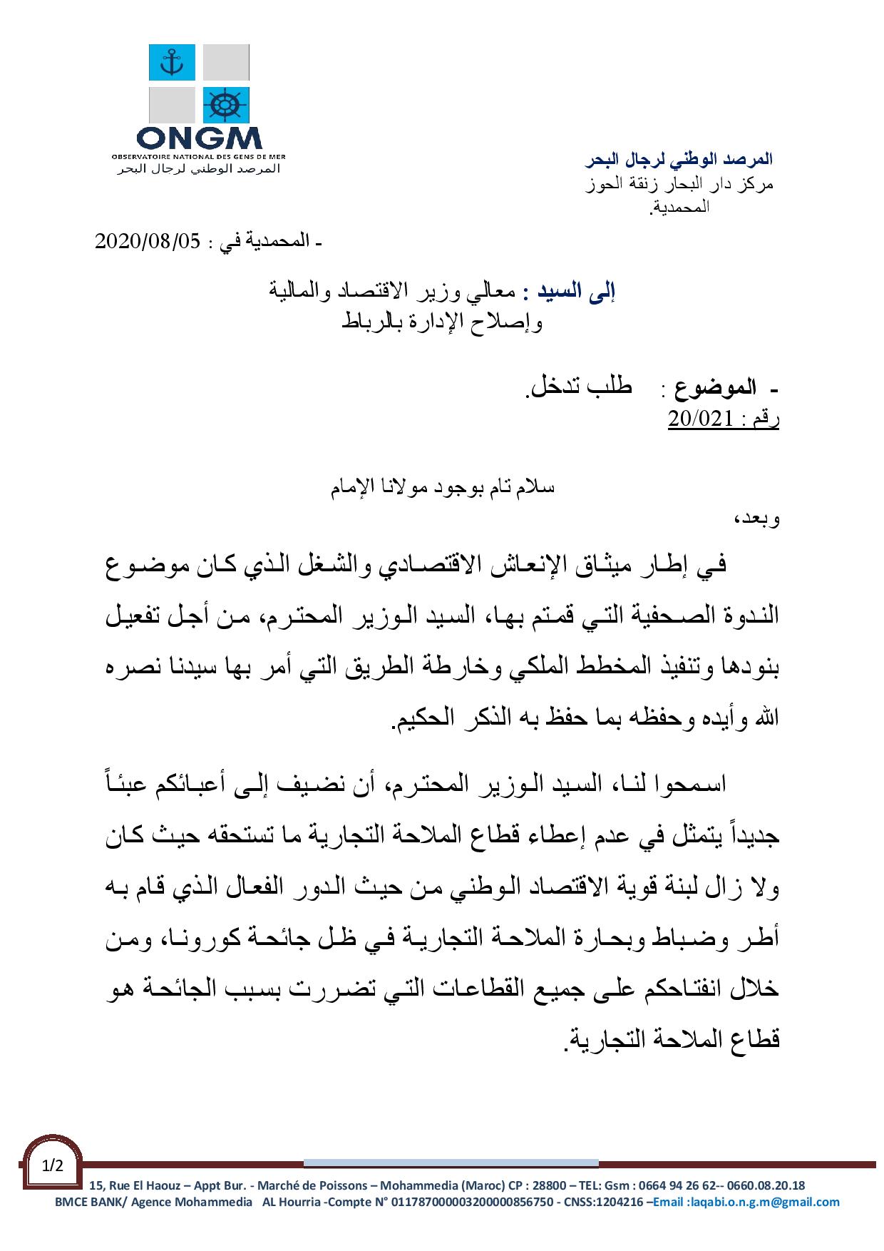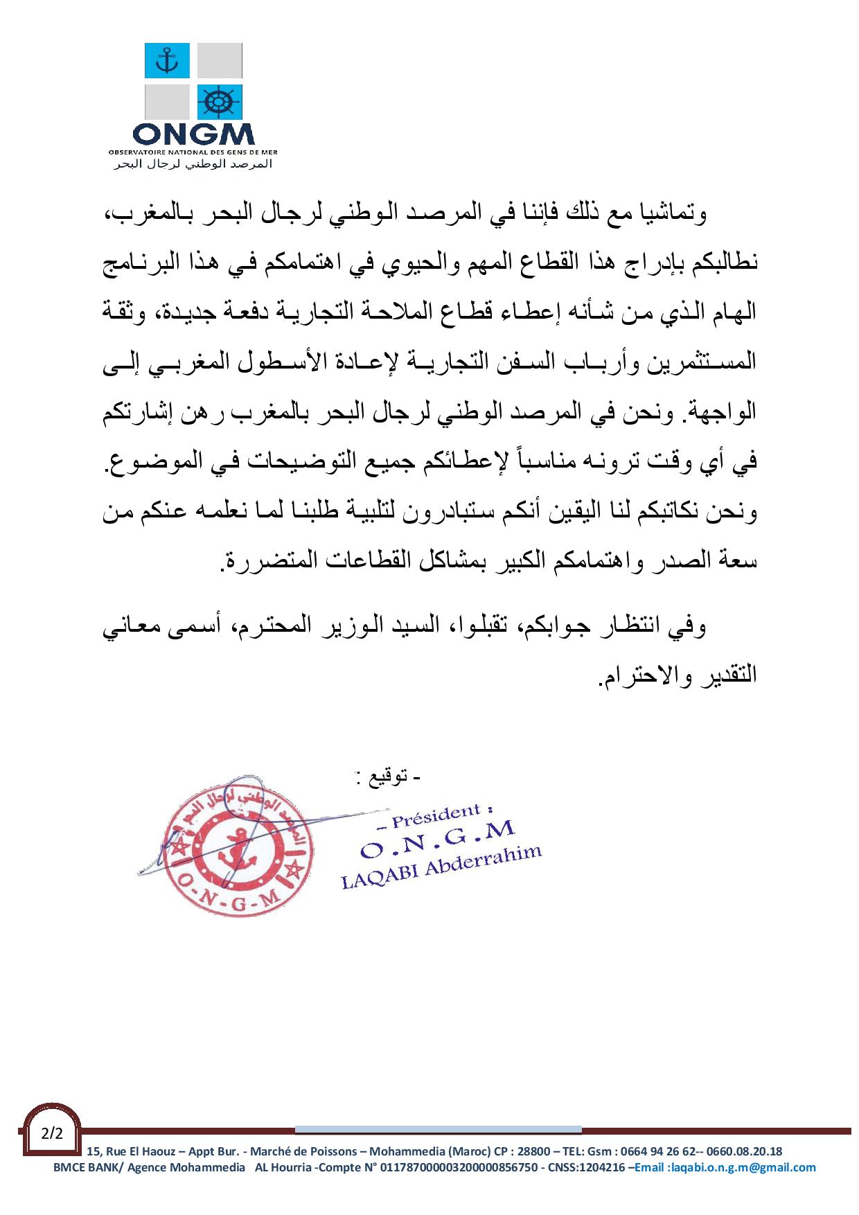 وتماشيا مع ذلك فإننا في المرصد الوطني لرجال البحر بالمغرب؛ تطالبكم بإدراج هذا القطاع المهم والحيوي في اهتمامكم في هذا البرنامج الهام الذي من شأنه إعطاء قطاع الملاحة التجارية دفعة جديدة؛ وثقة المستثمرين وأرباب السفن التجارية لإعادة الأسطول المغربي إلى الواجهة.