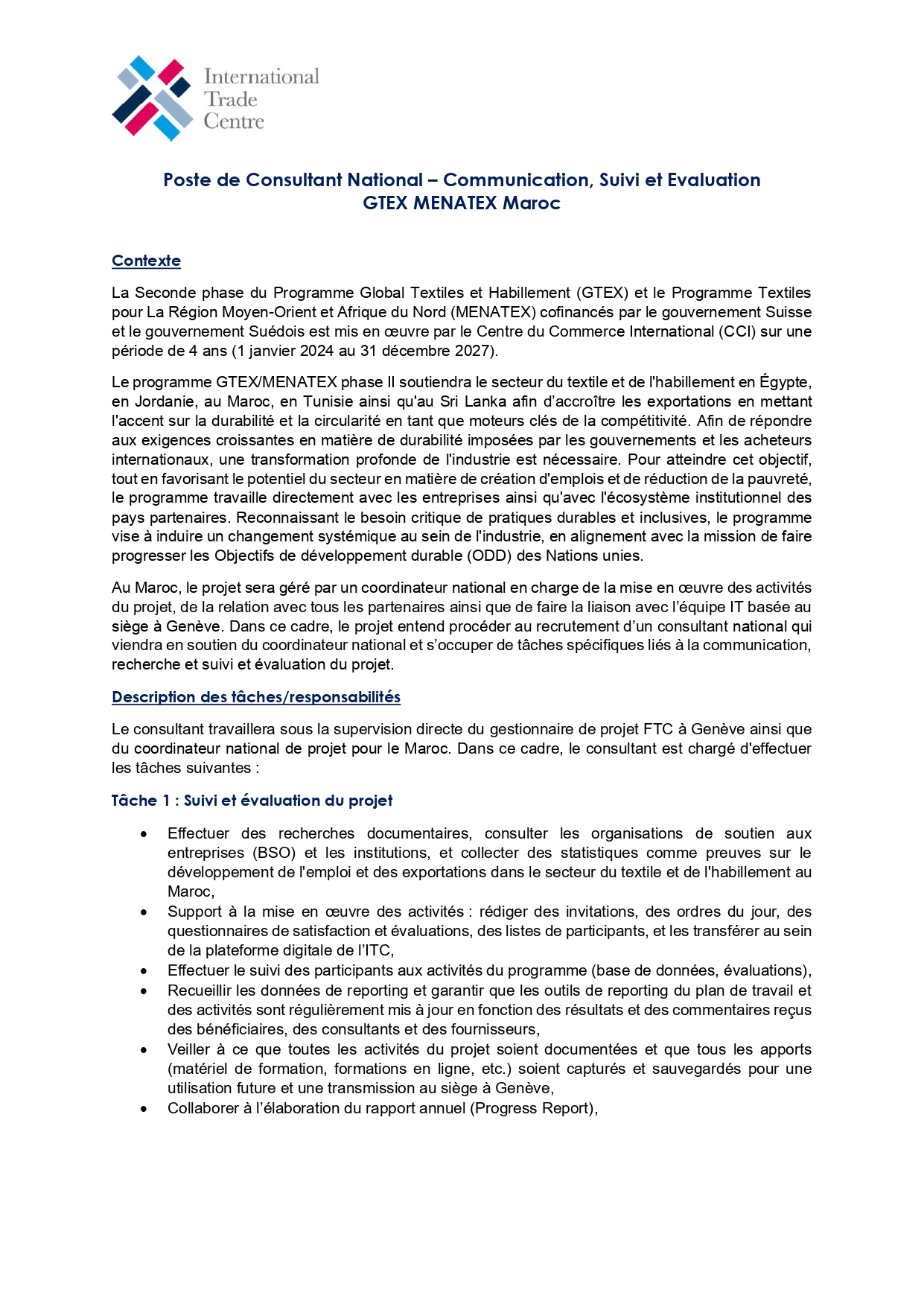 Vous étes passionné par le commerce international et désireux de contribuer à des projets d'assistance technique de grande envergure ? GTEX MENATEX, en partenariat avec l'International Trade Centre, SECO Coopération et développements économiques, et Sida, vous offre une opportunité unique de faire partie d'une initiative innovante.