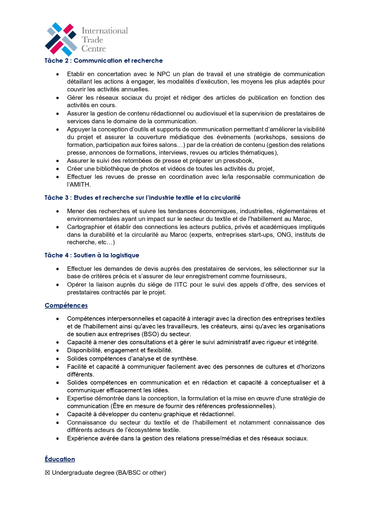 Ne manquez pas cette chance exceptionnelle de faire avancer votre carrière tout en ayant un impact positif sur les communautés locales et régionales. Envoyez dès maintenant votre CV à dclement@intracen.org pour saisir cette opportunité de vous joindre à équipe GTEX MENATEX.