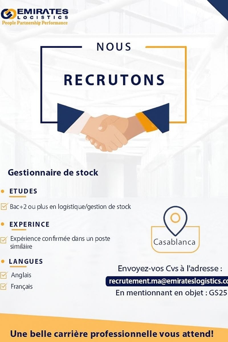 L’entreprise Emirates Logistics Morocco, acteur international de référence dans le domaine de la logistique et du transport, annonce le recrutement d’un Gestionnaire de Stock (H/F) pour sa plateforme logistique basée à Casablanca.