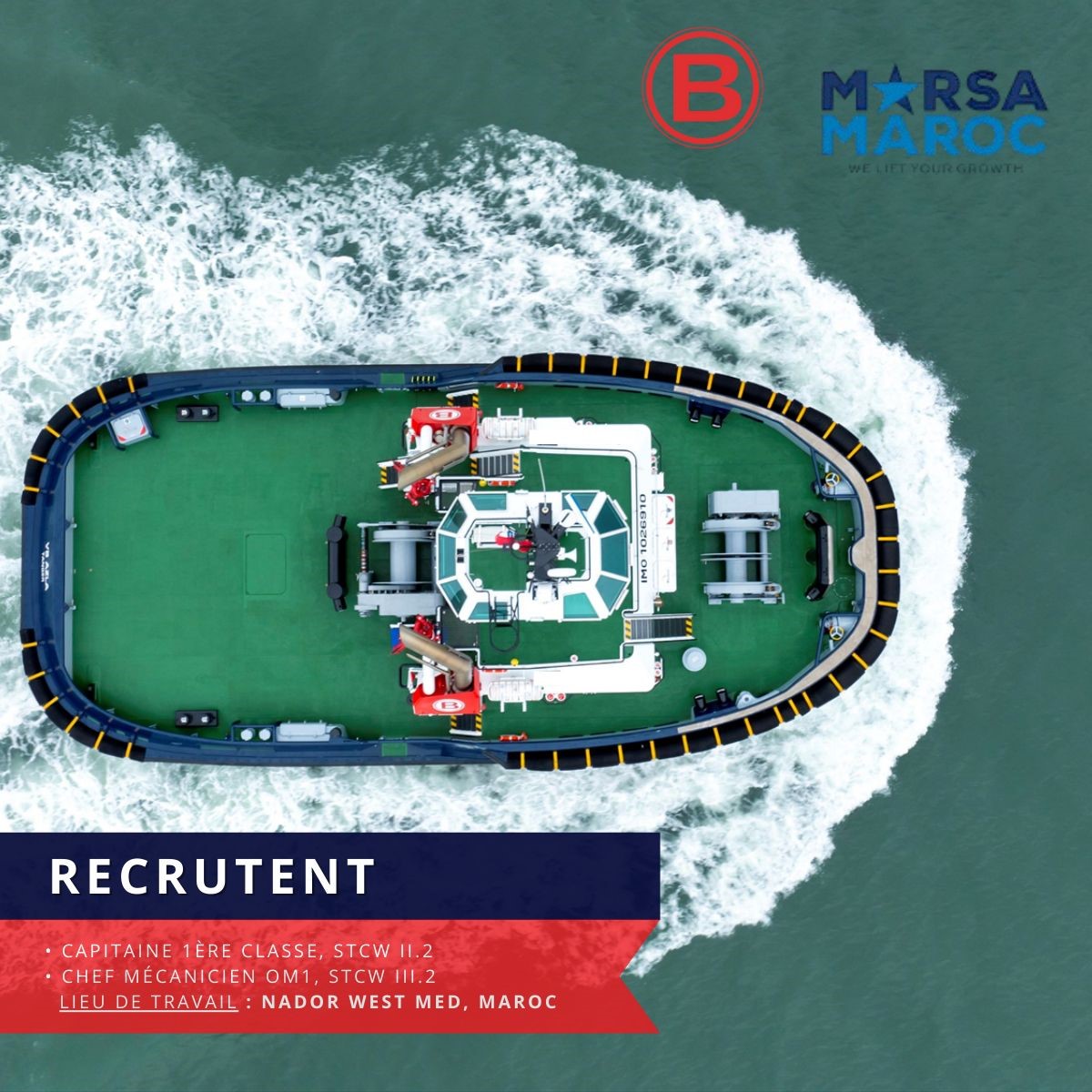 La nouvelle société de remorquage portuaire WEST MED TOWAGE, issue du partenariat entre BOLUDA Towage France et Marsa Maroc, lance un recrutement d’officiers marocains de 1ère classe Pont et Machine afin de constituer l’équipage de ses nouveaux remorqueurs.