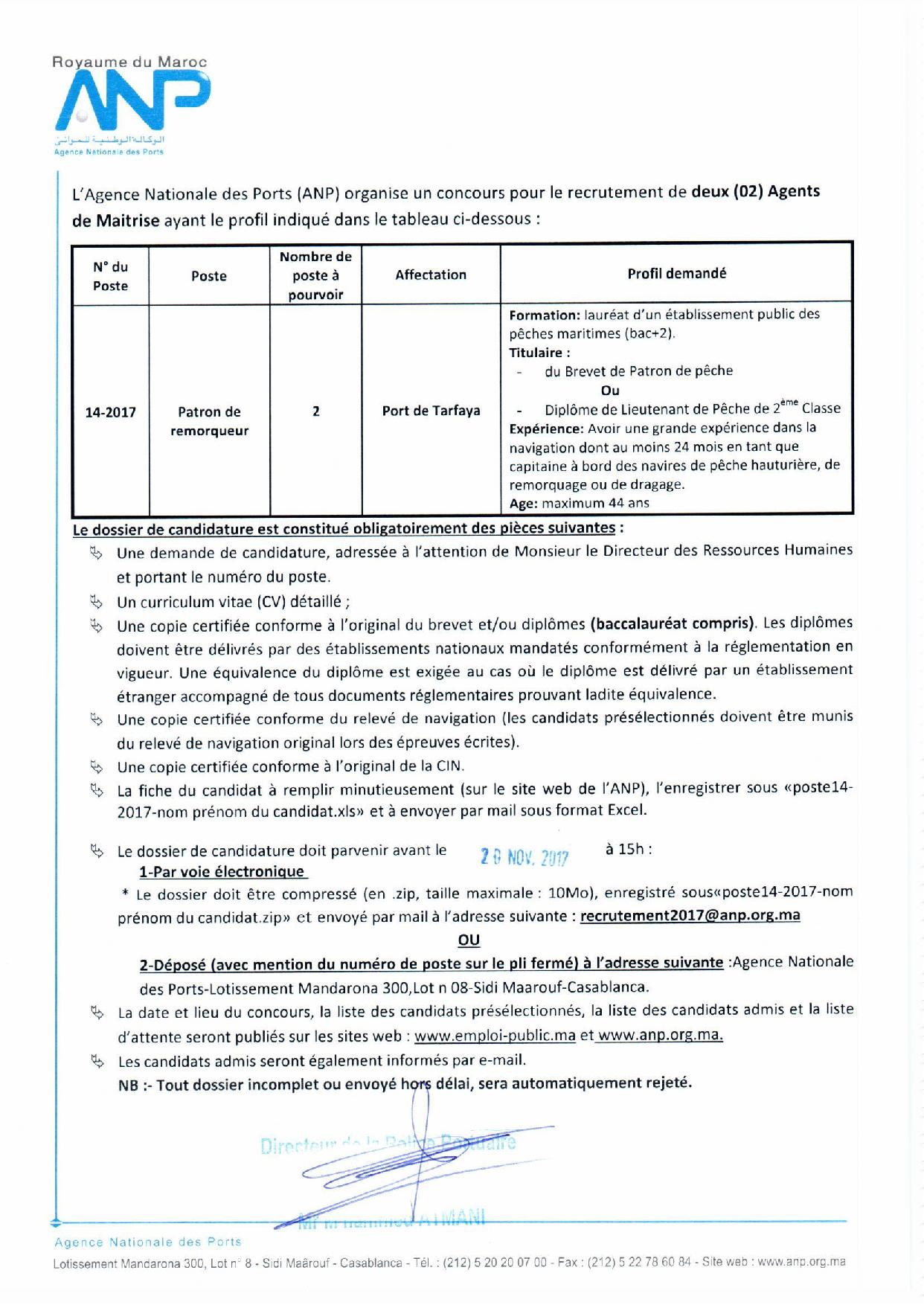 Patron de remorqueur (ANP) Offres d'emploi Previous Article Agent de la capitainerie (ANP) Next Article Agent mécanicien remorqueur (ANP) Tools Imprimer E-mail Typography Font Size Default Reading Mode Share This Date de publication de l'annonce: 3/11/17 Date de fin de publication: : 20/11/17 Annonceur: ANP Contact de l'annonceur: recrutement2017@anp.org.ma Previous Article Agent de la capitainerie (ANP) Next Article Agent mécanicien remorqueur (ANP)